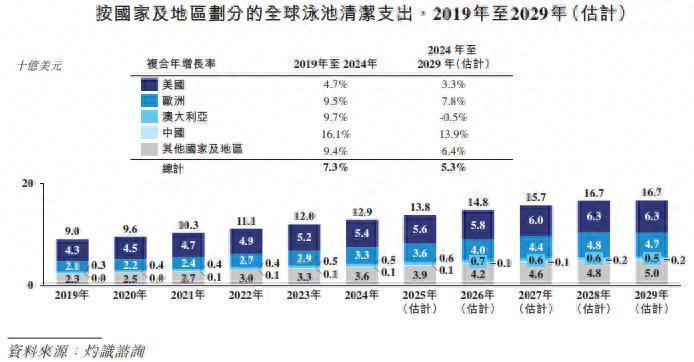 受益于全球城市化加快,以及住宅建筑、酒店、学校及其他商业场所数量增加所带动,近年来全球泳池数量持续增长。数据显示,截至去年底全球泳池总数约为3290万个,预计到2029年将增加至3930万个,对应年复合增长率为3.6%。泳池文化持续渗透进普罗大众日常生活中,这也使得相应的泳池清洁支出水涨船高。2024年,全球泳池清洁支出约为129亿美元,预计至2029年将进一步增加至167亿美元股票配资行业门户网站,对应期间复合年增长率为5.3%。